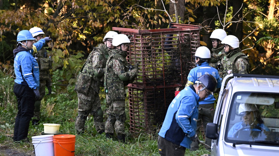 11月5日,日本自卫队员在秋田县设置用于捕熊的陷阱。\n 新华社发